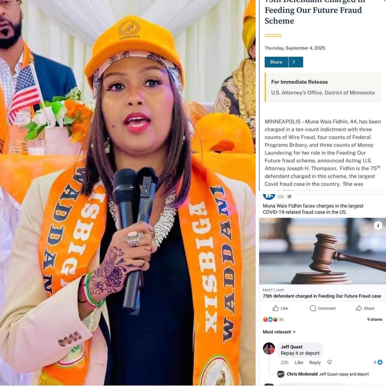 Muna Wacays Fidhin, oo 44 jir Soomaali ah, gaar ahaan reer Somaliland, ayaa Jimcihii lagu xiray magaalada Minneapolis, waxaana lagu soo oogay toban dacwadood, oo ay ku jiraan khayaano xagga isgaarsiinta ah, laaluush, iyo been xalaaleyn lacag, sida uu sheegay Xafiiska Xeer-ilaaliyaha Guud ee Mareykanka ee Minnesota.