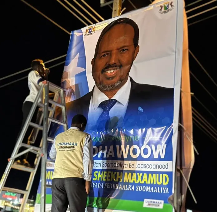 Saacadihii u dambeeyay ayaa waxaa waddooyinka waaweyn ee Laascaanood lagu arkayay sawirrada Madaxweyne Xasan Sheekh iyo calanka qaranka oo laga taagay.
