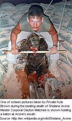 Muddo kadib , Trooper Kyle Brown ayaa la wareegay xilkii waardiyaha ,waxa uu ku bilaabay in uu qaniino Shidane, Asgarigii uu xilka kala waragayay ayaa yiri: Waxaad doonto ku samey Shidane laakin ha nagu dilin. Hase yeeshee, Brown ayaa yiri: waan dilayaa. (Brown replied that he wanted to “kill this fucker”). Sida Markhaati uu maxkamada ka hor cadeeyay.